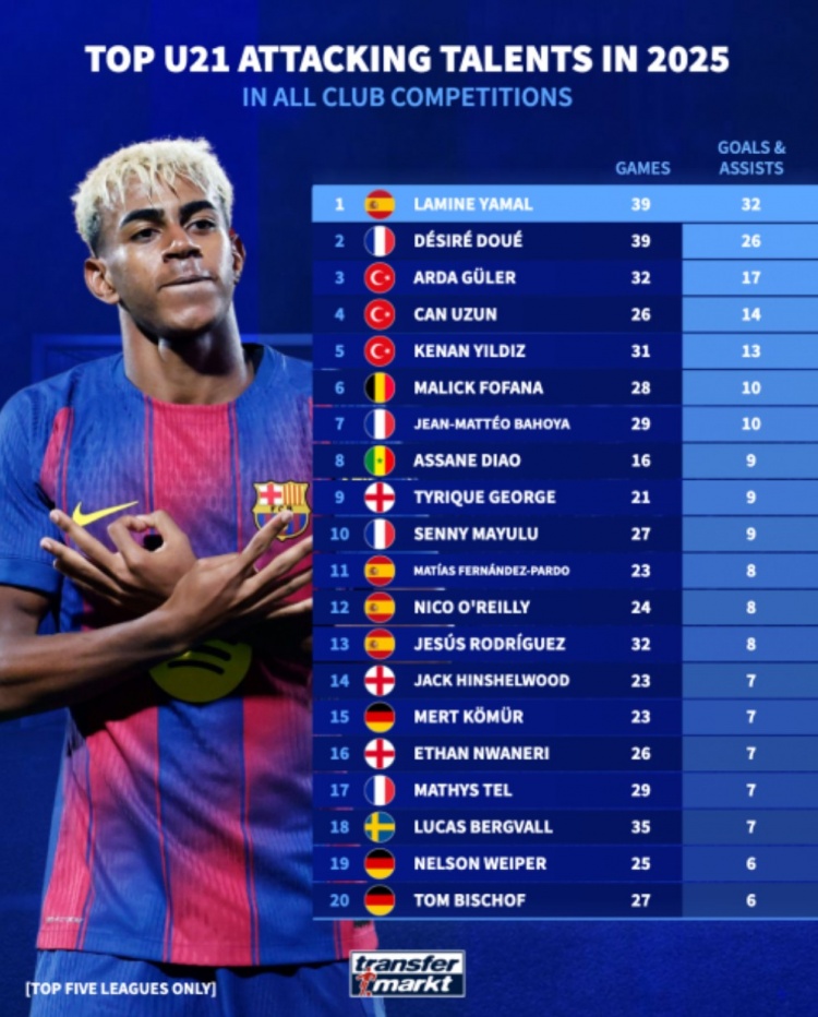 25年俱乐部层面参与进球数最多U21球员排行:亚马尔39场32球居首